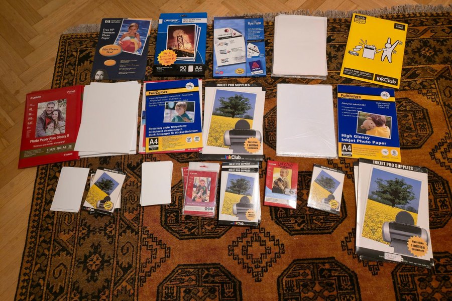 Diverse fotopapper i A4- och 10x15-format från märken som Canon, HP, FullColors och InkClub. Ett antal dubbelsidiga fotopapper och därtill fotopapper för magneter och cd-skivor. Ett par hundra ark totalt.
