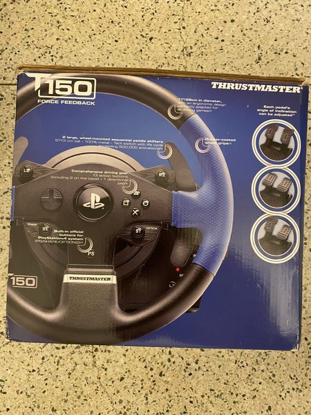 Thrustmaster T150 Force Feedback racingratt med 11"/28 cm diameter och ergonomisk design. Paddelväxlarna är 5"/13 cm höga och tillverkade i 100% metall. 13 actionknappar och en riktningsknapp. Inbyggda officiella knappar för PlayStation4-systemet (PS/SHARE/OPTIONS). Pedalernas lutningsvinkel kan justeras.