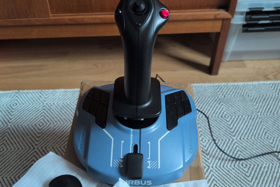 Thrustmaster TCA Sidestick Airbus Edition i bra skick, har enbart använts i hemmasimulator. Komplett med tillbehör för att byta till right-handed mode. Ingen drift vad jag har märkt. Den har en ergonomisk design inspirerad av Airbus sidestick, med flera programmerbara knappar och en inbyggd gasreglage.