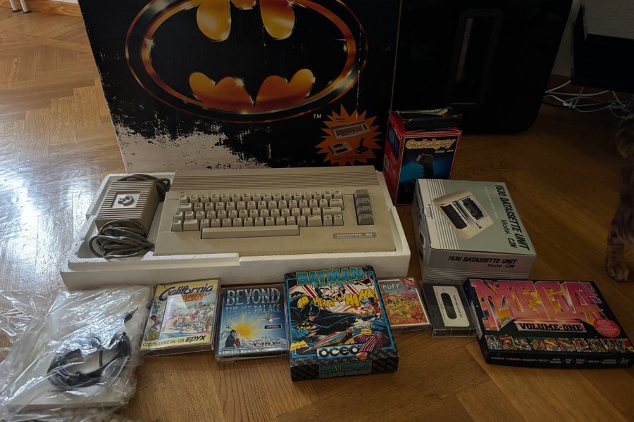Commodore 64 paket (Batman edition) innehållande dator, bandstation, joystick och några spel.