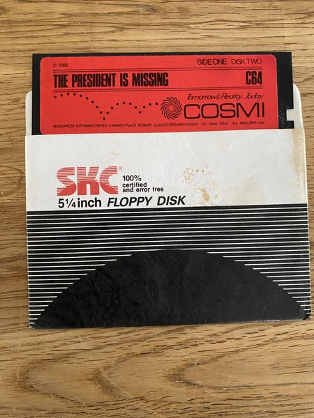 För Commodore 64. Spelet är "The President is Missing" utgiven av Cosmi.