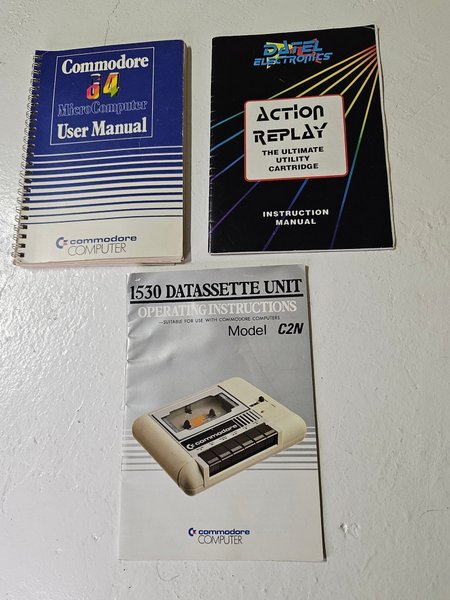 Manualer för Commodore 64. Inkluderar användarmanual för Commodore 64 MicroComputer, instruktionsmanual för Datel Electronics Action Replay, och bruksanvisning för 1530 Datassette Unit Model C2N.