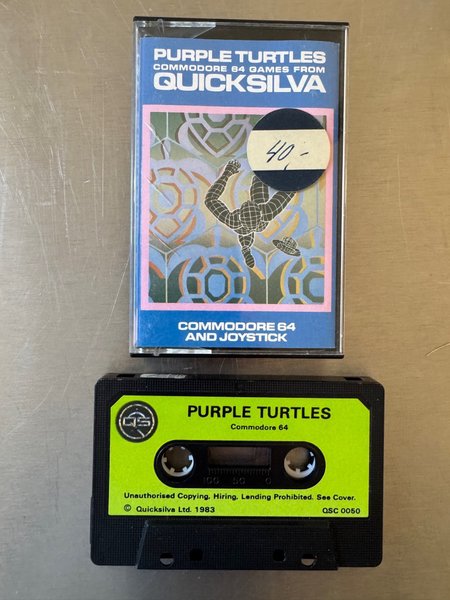 Originalt Purple Turtles spil til Commodore 64. Udgivet af Quicksilva i 1983. Kommer med kassettebånd og original kasse. Testet til opstart.