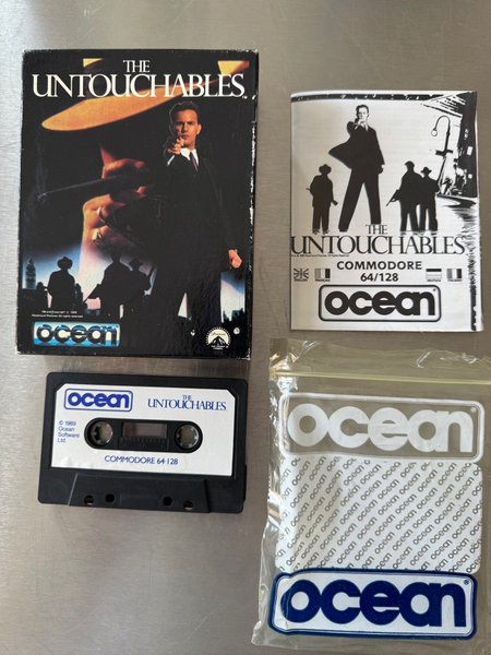 Komplet udgave af The Untouchables til Commodore 64/128. Indeholder spil, manual og klistermærker. Testet til opstart.