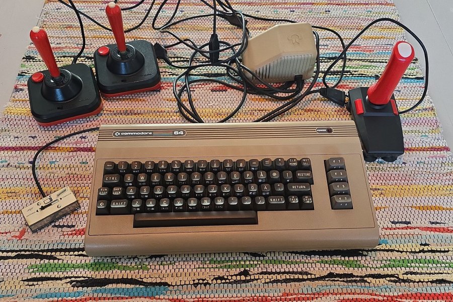 Commodore 64 med tre joysticks och strömadapter.
