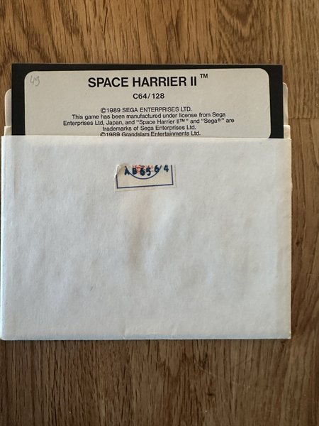 Space Harrier II för C64/128. Spelet är tillverkat under licens från Sega Enterprises Ltd, Japan. "Space Harrier II" och "Sega" är varumärken som tillhör Sega Enterprises Ltd. Utvecklat av Grandslam Entertainments Ltd.