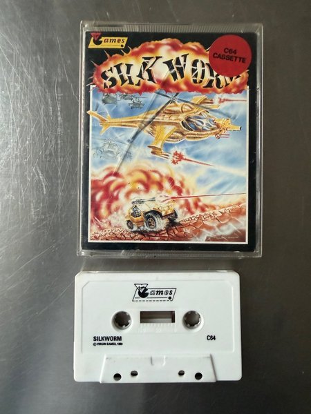 Silkworm til Commodore 64 på kassettebånd. Udgivet af Virgin Games i 1989. Testet til opstart.