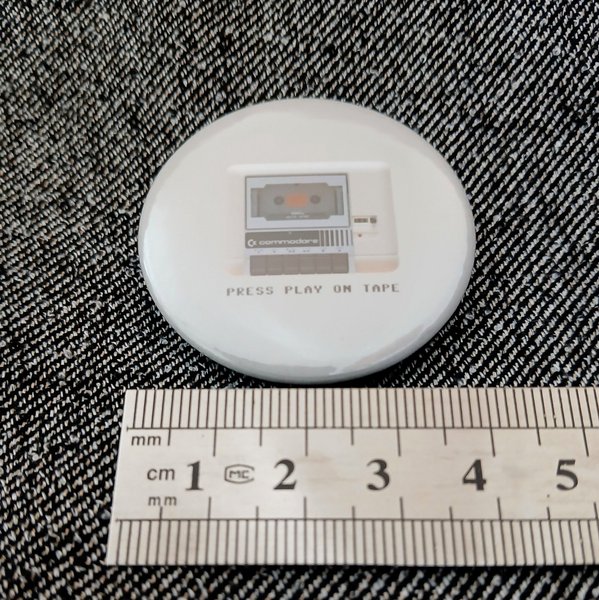 Brosch som fästs med nålanordning på baksidan. Press play on tape. Commodore 64. Se gärna mina andra annonser, jag samfraktar inom en vecka.
