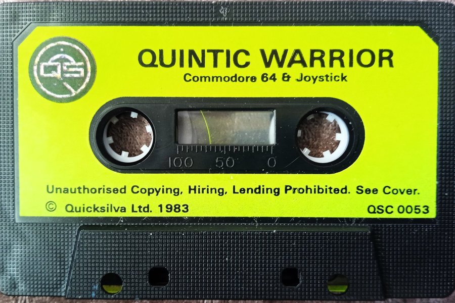 Kassettband med spelet QUINTIC WARRIOR för Commodore 64. Utgiven av Quicksilva Ltd. 1983. Modellnummer QSC 0053.