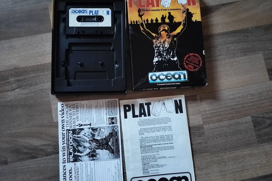 Platoon för Commodore 64-128. Spelet kommer på kassett och inkluderar originallådan samt två informationsblad. Ett av bladen innehåller information om en tävling för att vinna en video av Platoon, samt regler och en kupong. Det andra bladet innehåller instruktioner och information om spelet, inklusive upphovsrättsinformation och kontaktuppgifter för support. Spelet är utvecklat av Ocean Software Limited.
