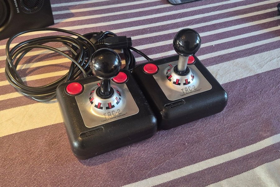 Ett par Suncom TAC-2 Totally Accurate Controller joysticks. Dessa joysticks är designade för att ge en exakt kontrollupplevelse. Perfekta för retrospelentusiaster.