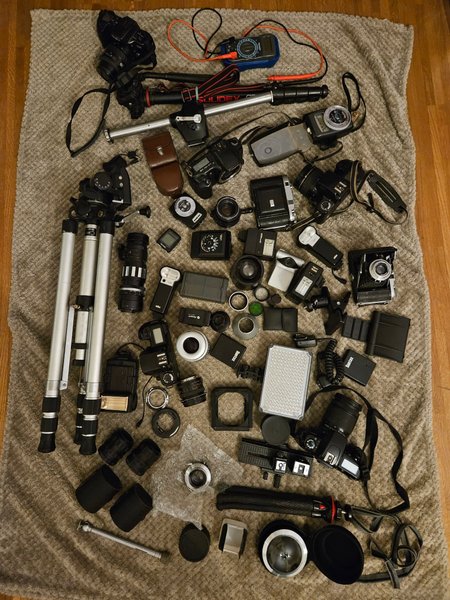 Parti med kamerautrustning. Innehåller flera kameror, objektiv, stativ, blixtar och diverse tillbehör för fotografering. Bland annat en Canon systemkamera, en Minolta systemkamera, en Soligor monopod, en Braun blixt, en Tronic ljusmätare och en LED-belysning.