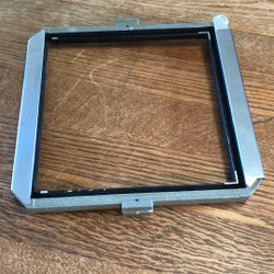 Objektivplatta för Toyo-View storformatskameror. Plattan är svart och har en cirkulär öppning i mitten för montering av objektiv. Den har även fästen på sidorna för att säkra den i kameran.
