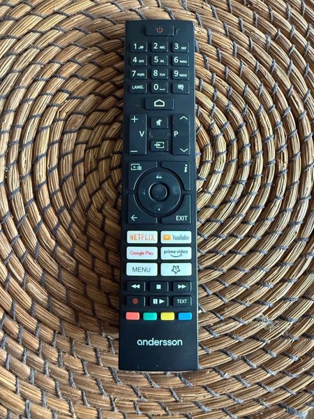 Fjärrkontroll av märket Andersson. Den har knappar för Netflix, Youtube, Google Play och Prime Video.