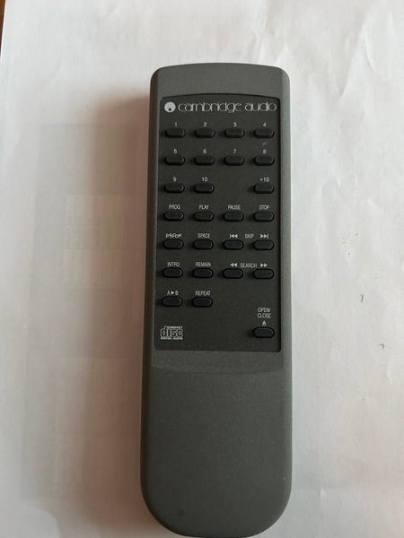 Fjärrkontroll från Cambridge Audio. Funktioner inkluderar sifferknappar, volymkontroll, play, pause, stop, skip, search, open/close, repeat, intro, remain, space, random, prog, +10.