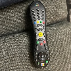 Säljer en fjärrkontroll. Den har knappar för TV-kontroll, setup, app, volym och sifferknappar.
