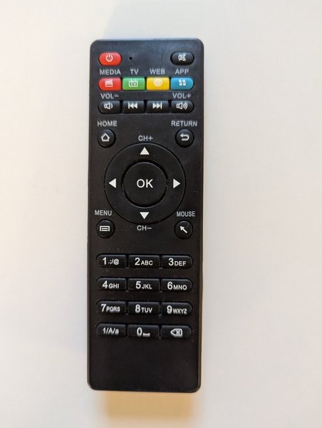 En fjärrkontroll för diverse elektroniska apparater. Den har knappar för MEDIA, TV, WEB, APP, VOL-, VOL+, HOME, RETURN, CH+, CH-, MENU och MOUSE. Den har också en numerisk tangentbord.