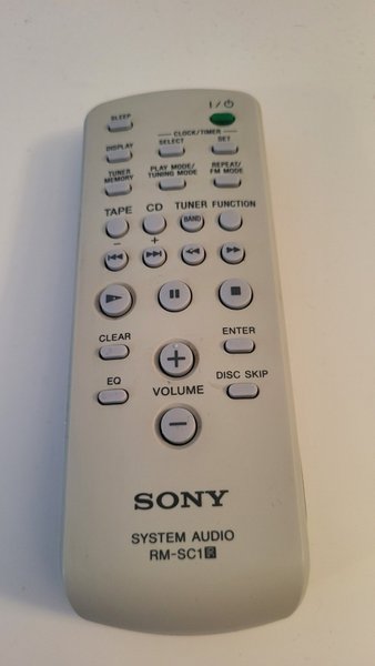 Fjärrkontroll från Sony, modell RM-SC1. Kompatibel med Sony ljudsystem. Fjärrkontrollen har knappar för funktioner som "SLEEP", "DISPLAY", "CLOCK/TIMER", "SET", "TUNER MEMORY", "PLAY MODE/TUNING MODE", "REPEAT/FM MODE", "TAPE", "CD", "TUNER FUNCTION (BAND)", "CLEAR", "EQ", "ENTER", "DISC SKIP" samt volymkontroll och uppspelningsknappar.