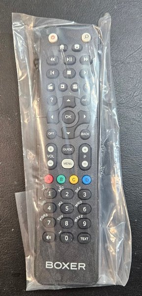Fjärrkontroll för Boxer-mottagare. Har knappar för kanalval, volymkontroll, menynavigering och uppspelningskontroller. Även numeriska knappar och färgade funktionsknappar finns.