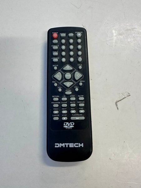 Fjärrkontroll för DVD-spelare av märket DMTECH. Fjärrkontrollen har knappar för ström, öppna/stänga, upprepa, siffertangenter (0-9, 10+), textning, vinkel, språk, tid, inställning, titel, PBC, volymkontroll, zoom, retur, L/R, steg, slow, program, rensa, mute, display, föregående, nästa, spola bakåt, spola framåt, V-läge, stopp och spela/pausa.