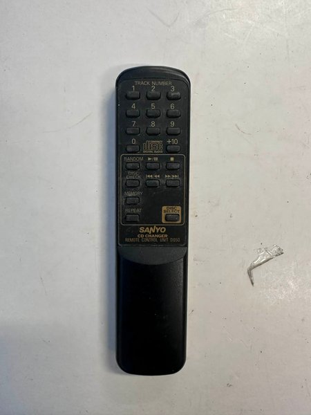 Fjärrkontroll för Sanyo CD-växlare, modell D650. Enheten har knappar för spårnummer (0-9, +10), slumpmässig uppspelning, skivkontroll, minne, upprepning och skivval. Den är designad för att styra en CD-växlare.