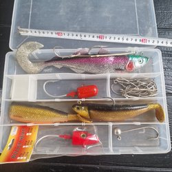En samling av olika fiskebeten Inkluderar både gummibeten och metallpilk Passar för Norgefiske