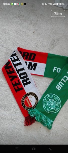 Halsduk med Feyenoords färger rött, vitt och svart, samt Celtics färger grönt och vitt. Båda klubbarnas logotyper finns i varsin ände av halsduken.