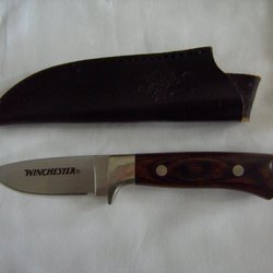 En kniv med ett trähandtag och ett läderskydd. Kniven har en slät och vass bladdesign, vilket gör den användbar för olika ändamål. Läderfodralet är prytt med nitar och ger ett bra skydd för kniven. Passar bra för friluftsliv eller som en del av en samling.
