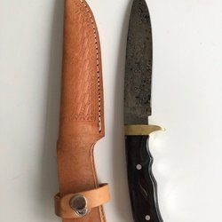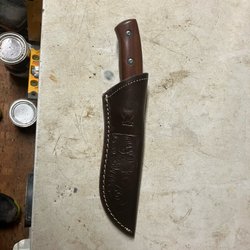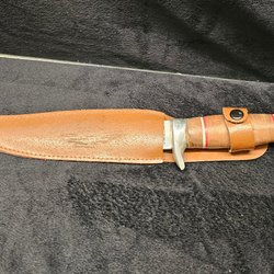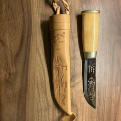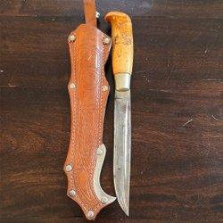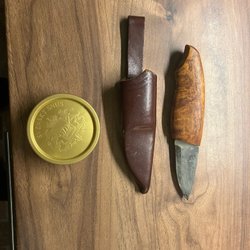 En kniv med en trähandtag och en läderslida. Passar för olika användningsområden. Lämplig för friluftsliv eller som verktyg i hemmet.