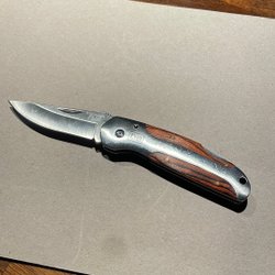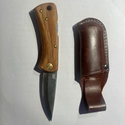 Fällkniv med trähandtag och stålblad. Inkluderar ett fodral för förvaring. Lämplig för utomhusaktiviteter och vardagligt bruk.