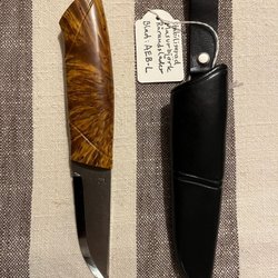 En kniv med ett handtag av stabiliserad rot och en läderslida. Kniven har en klassisk design med vackra detaljer i ek och mässing total längd 17cm signerad IL bladet smitt av JB