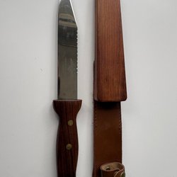 Jaktkniv i rostfritt stål. Längd c:a 28 cm. Blad c:a 16,5 cm. Knivfodral ingår. Mindre avflagning av färg på lädret på skaftet, som övermålats (se sista bilden). Annars bra skick.