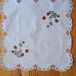 Handbroderad duk i vit linne med vacker uddspets runt. Den är broderad med vitt garn. Den är ca 50 cm x 48 cm. Den är i mycket fint skick, men det finns två små hål. Därför är priset lågt..