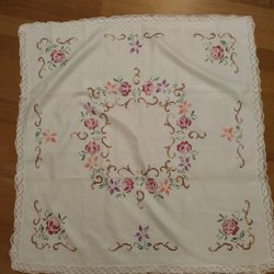 En broderad duk med ett fint mönster i rött och grönt.