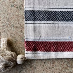En vacker broderad duk från L'atelier. Den är vit med röda ränder och har initialerna ”LA” broderade i rött.