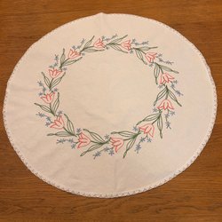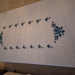 Hemvävd duk (min mor) med fransar. Längd med frans 50cm, längd utan frans 34cm och 33cm bred.