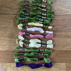 En handbroderad duk med blommor.