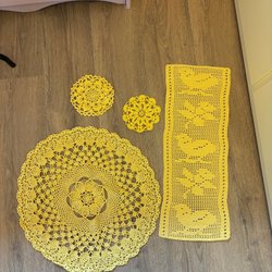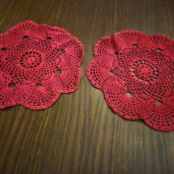 Två små fina virkade dukar i en persikofärgad nyans. Perfekt som en dekorativ detalj i hemmet.