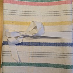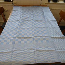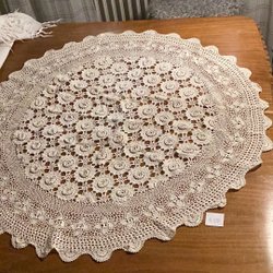 Stor broderad duk, 271x136cm, med broderier i vitt, beige, grått o ljusblått och spetskant, 7cm, och infälld spets 5,5 cm. Perfekt för att ge en touch av vintage charm till ditt hem.