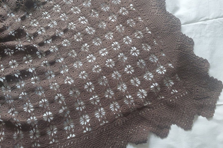 Ett vackert virkat duk i en brun nyans. Detaljerat blommönster och dekorativ kant.