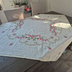 Vit broderad duk av bomull. Broderad i korsstygn i olika gula och bruna nyanser i moulinegarn