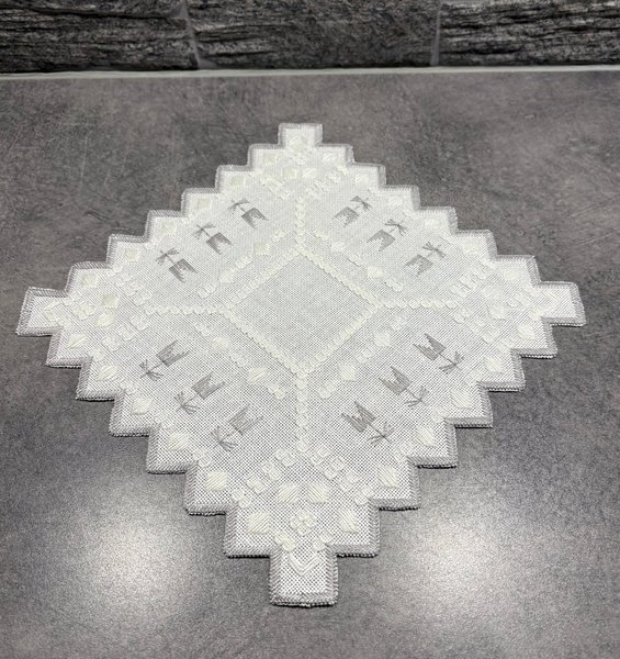 "Broderad duk" - med vitt/grått mönster.