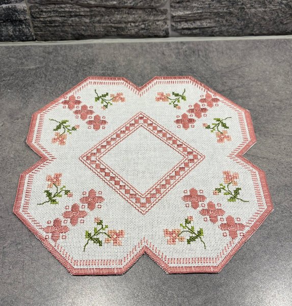 "Broderad duk" - med rosafärgade blommor.