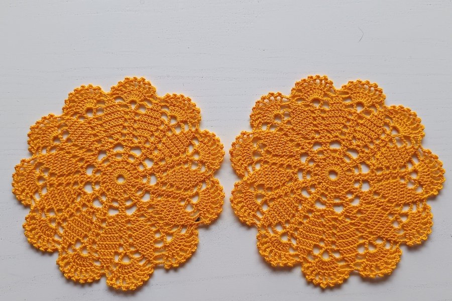 .....som består av två nyvirkade små dukar i kycklinggult. Diametern på dukarna är ca 16 cm. Dukarna är virkade i kabeltvinnat bomullsgarn i grovlek 12/3. Perfekt i fönstret eller som underlägg vid dukning.