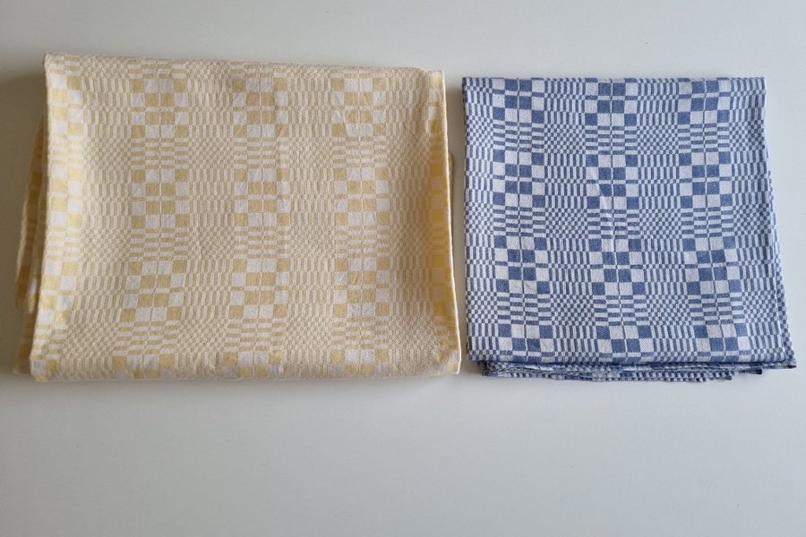 Blå duk ca 120x120 cm och gul duk 114x169 cm.