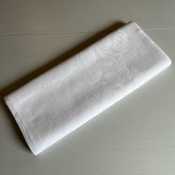 En vacker vit linneduk med en virkad detalj i mitten samt hålsöm runt om.