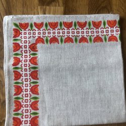 En duk med ett detaljerat mönster i ljusa färger. Duken har ett centralt mönster och en matchande kant storlek 120 x 110 cm