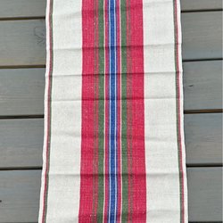 En vacker hemvävd bordslöpare . Den har ett dekorativt mönster i ljusa färger som aprikost och lila. Perfekt för att ge ditt bord en extra touch. 1,15m x 41 cm. Använd men ej tvättad.