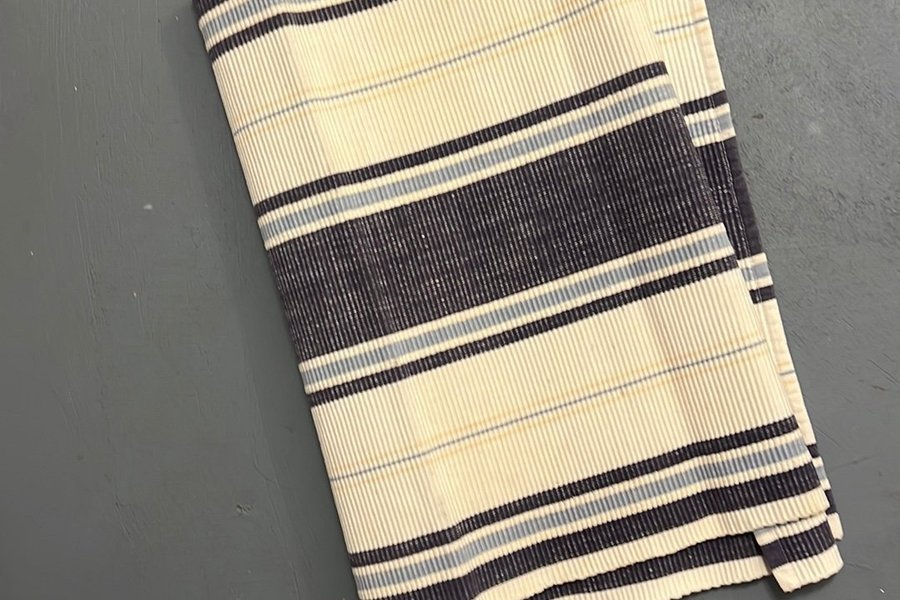 Bordstablett med randigt mönster. Färgerna inkluderar off-white/kräm, mörkblå, ljusblå och en tunn gul/beige rand. Har en ribbad struktur.
