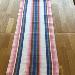 Hemvävd bordslöpare i rött och grönt, materialet lin/bomull (tror jag). Bredden är 31 cm, längden 110 cm och den är fållad. Vad jag vet så är den helt oanvänd och i mycket bra skick.